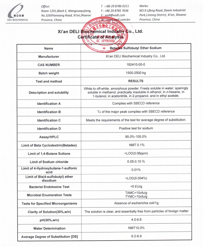 Acest grad de injecție Sulfobutyl Ether Beta Cyclodextrin Sodium este fabricat conform unui sistem cuprinzător de management al calității. Atributele cheie de calitate, inclusiv identificarea, testarea, gradul mediu de substituție, impuritățile reziduale, nivelurile de endotoxine și limitele microbiene sunt strict controlate.